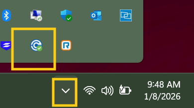 You can connect to the VPN by right-clicking on the Sophos Connect icon, a blue and white circle with a blue dot in the center, at the bottom right of your screen. If it's not visible, click the up arrow (located in the system tray) next to the small icons.