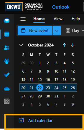 If you're using the New Outlook, there will be an "Add Calendar" button below the mini calendar on the left side of the screen.