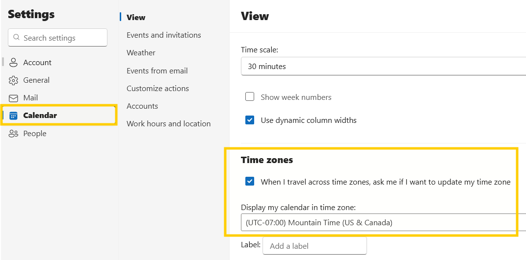 Once signed in, click on the gear icon in the top right corner of your web app to open the options window, then find Calendar in the left-most menu. In the Calendar option on the right, scroll down until you find the Time zones section.